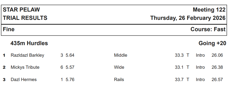 One of three hurdlers to make the long journey north with trainer Rick Holloway, Razldazl Barkley set the standard when clocking 26.06sec (+20) for the 435m trip with kennelmates Mickys Tribute and Dazl Hermes subsequently posting 26.38sec and 26.57sec respectively.