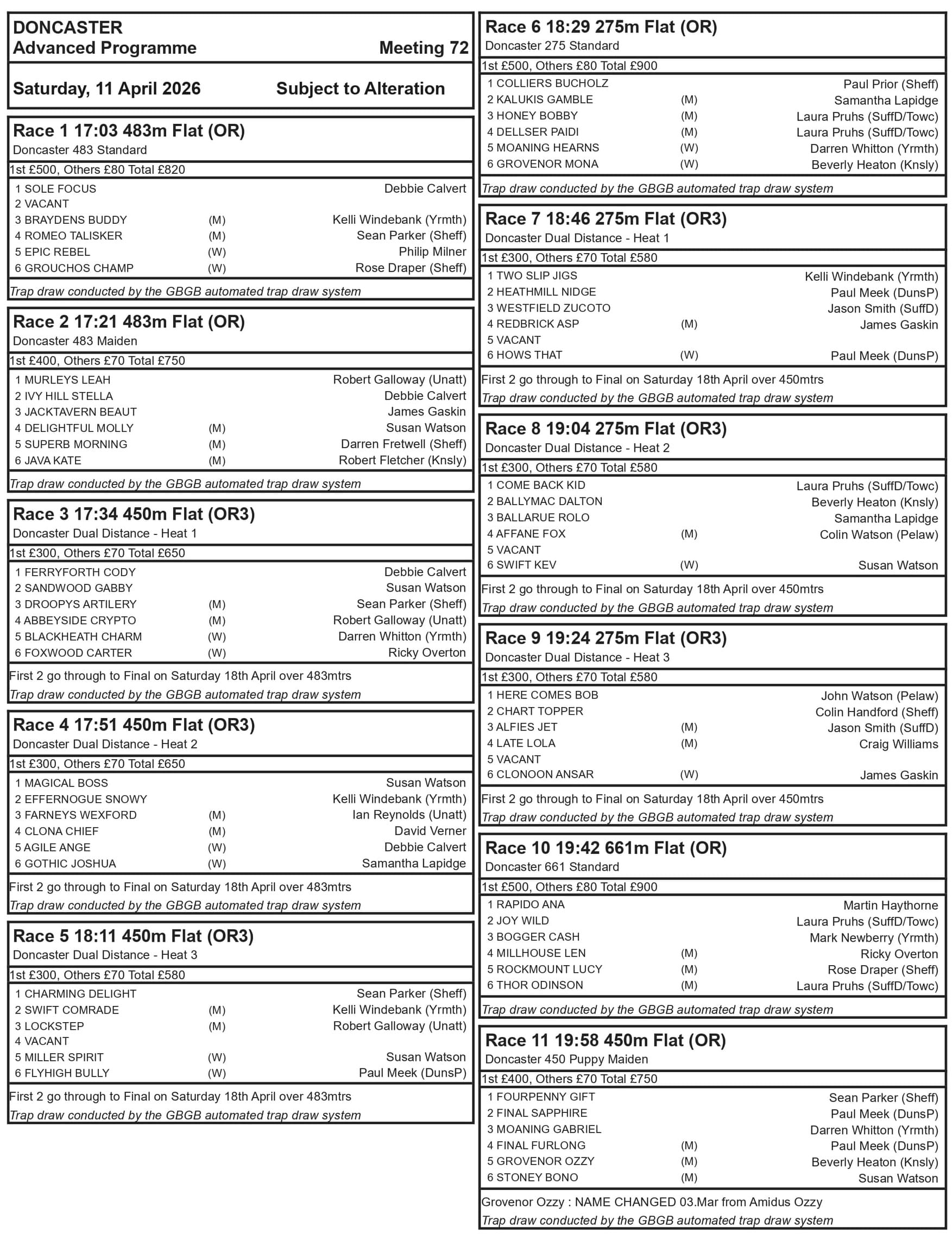 DONCASTER's enhanced prize money offered has resulted in an unprecedented 16-race card on Saturday 11th April including the heats of two dual distance competitions.