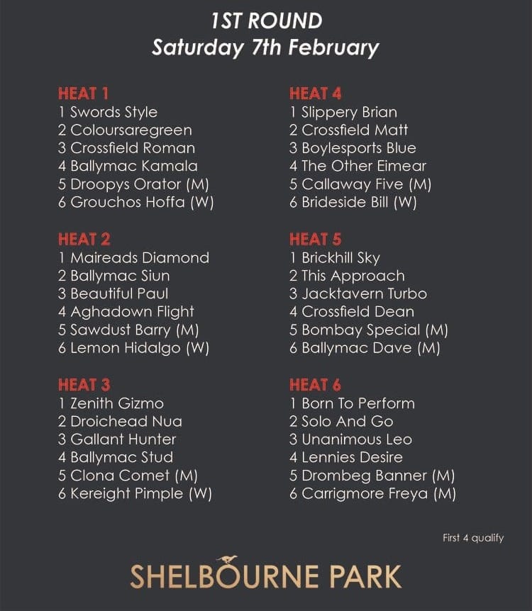 Tote Gold Cup (Shelbourne Park, final 28th February): 7/2 Solo And Go, 5 Ballymac Stud, 10 Unanimous Leo, 12 Ballymac Kamala, Sawdust Barry, 14 Bombay Special, Droichead Nua, Swords Style, 16 Lennies Desire, 18 Maireads Diamond, 20 bar (e-w 1/4 1,2,3,4).