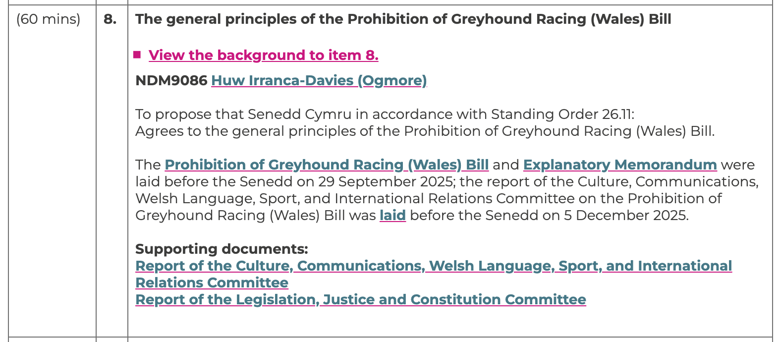 The Prohibition of Greyhound Racing (Wales) Bill is item 8 on the agenda for Plenary, the full meeting of all 60 members of the Senedd, and is likely to be discussed then voted on around mid-afternoon.