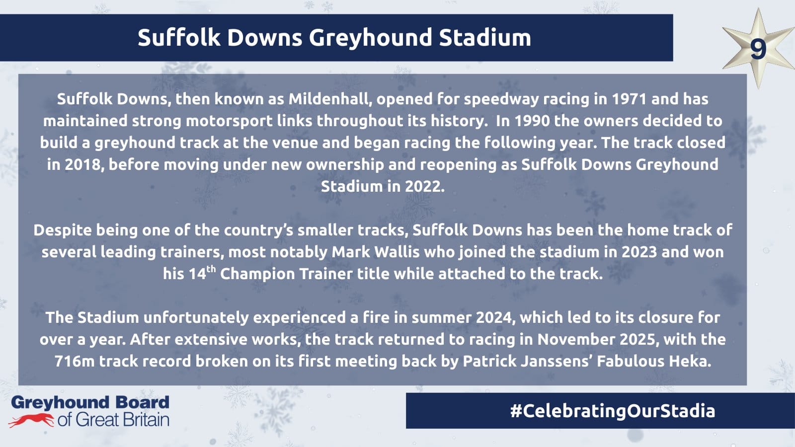 Suffolk Downs has had an even more roller-coaster recent history than Oxford, the originally-named Mildenhall venue having been closed for some four years until reopened for greyhound racing by Kevin Boothby under its new name in 2022.