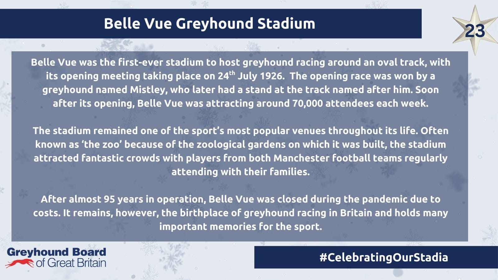 It comes ahead of the centenary year of greyhound racing in the UK in 2026, the first regulated meeting having taken place at Belle Vue in Manchester on July 24th 1926 when in excess of 1,700 spectators witnessed the inaugural 440 yards race won by a greyhound named Mistley.