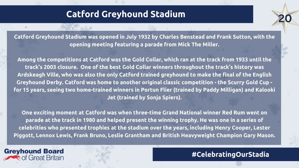 As well as the Gold Collar, Catford also staged the Scurry Gold Cup for many years prior to sudden closure in 2003.