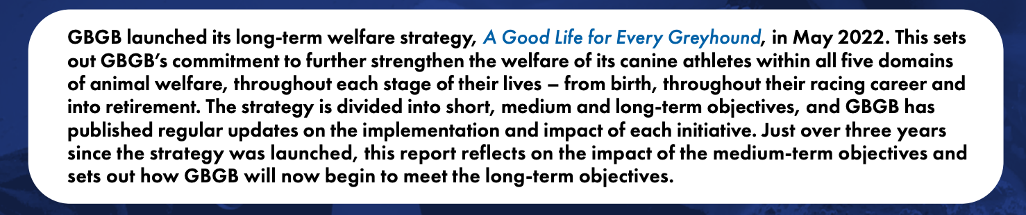THE GBGB has published its latest progress report on the implementation of its long-term welfare strategy, ‘A Good Life for Every Greyhound’.