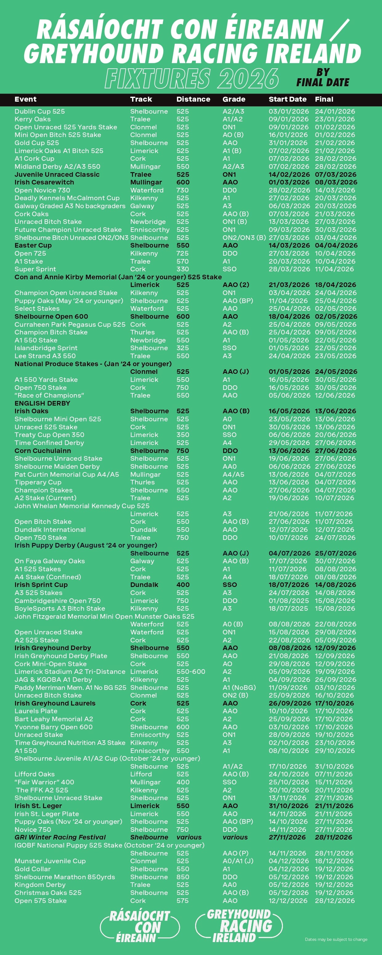 GREYHOUND Racing Ireland (RCÉ) has published the schedule of feature events and Classics for 2026.