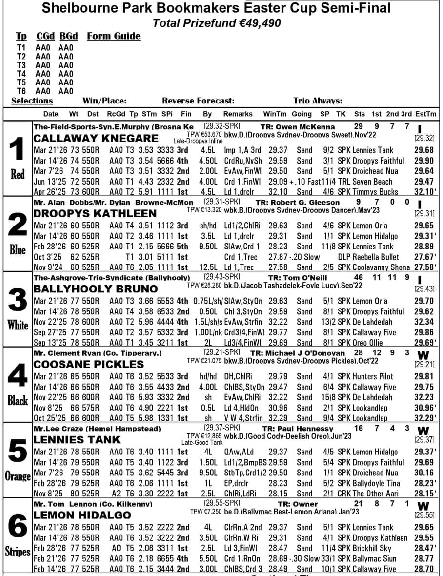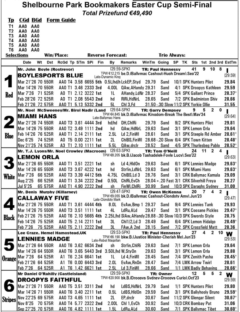 Shelbourne Park Bookmakers Easter Cup (final Saturday 4th April): 9/4 Lennies Tank, 4 Droopys Kathleen, 11/2 Droopys Faithful, 9 Callaway Five, 14 Callaway Knegare, Coosane Pickles, Lemon Orla, 16 Ballyhooly Bruno, Miami Hans, 20 Lemon Hidalgo, 28 Lennies Madge, 33 Boylesports Blue (e-w 1/4 1,2,3).