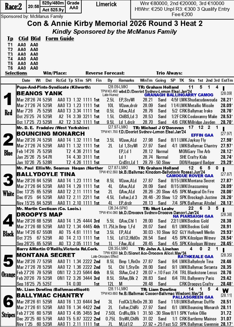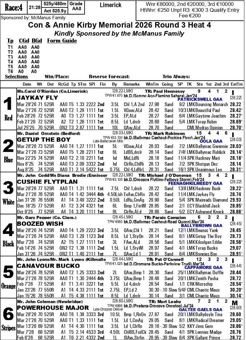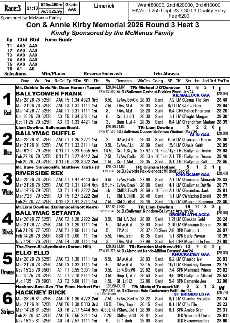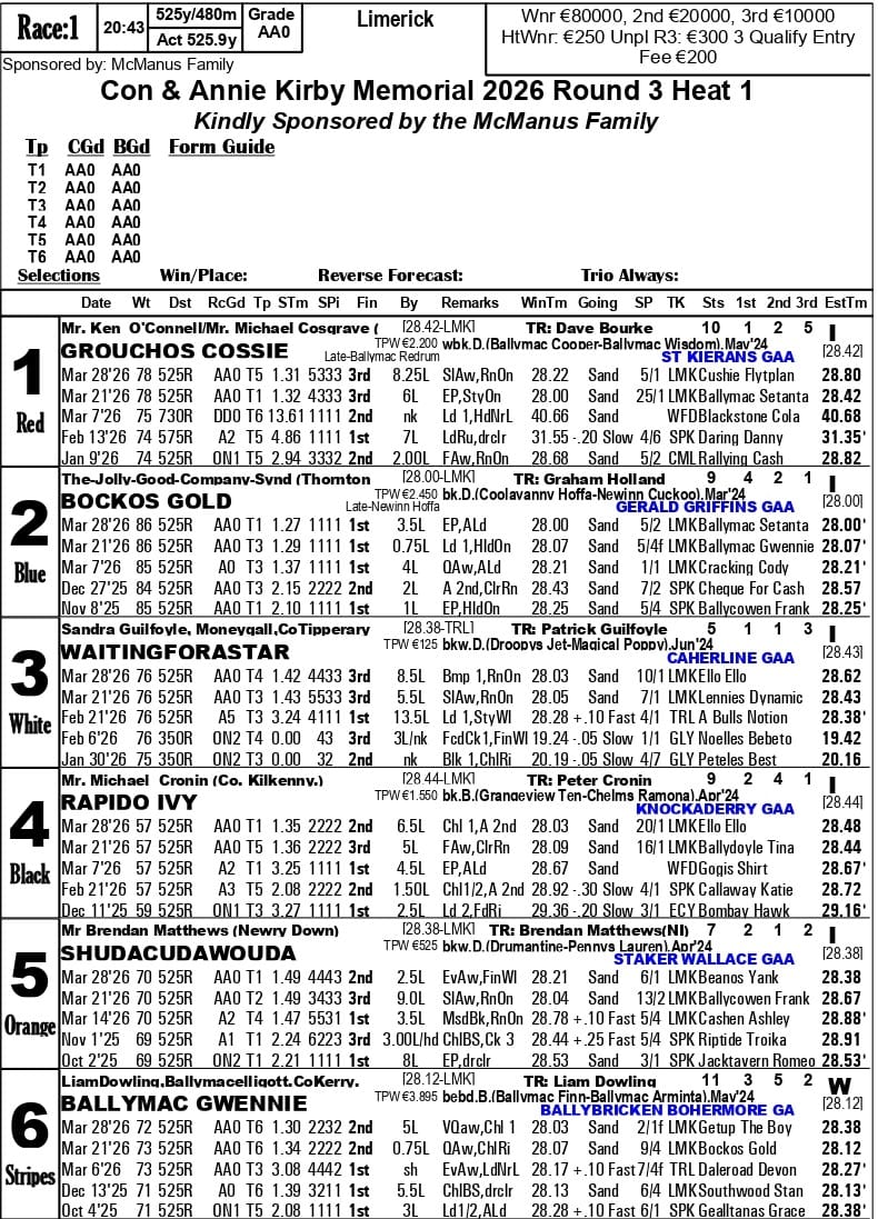 Con & Annie Kirby Memorial (Limerick, final Saturday 18th April): 9/2 Ballymac Setanta, 5 Bockos Gold, 6 Ballydoyle Tina, Bouncing Monarch, 10 Getup The Boy, 14 Ballymac Duffle, Ello Ello, 16 Ballymac Chantry, Beanos Yank, 20 bar (e-w 1/4 1,2,3,4).