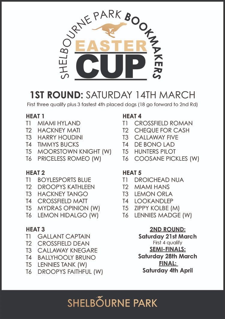 Shelbourne Park Bookmakers Easter Cup (final Saturday 4th April): 5 Lennies Tank, 7 Crossfield Matt, Droopys Faithful, 8 Callaway Knegare, Droopys Kathleen, 12 Droichead Nua, 14 Callaway Five, Coosane Pickles, Hackney Mati, Priceless Romeo, 16 Ballyhooly Bruno, Cheque For Cash, 20 bar (e-w 1/4 1,2,3,4).