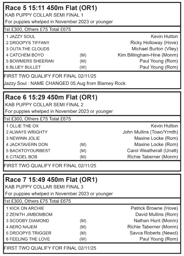 Draw for Sunday's KAB Puppy Collar semi-finals
