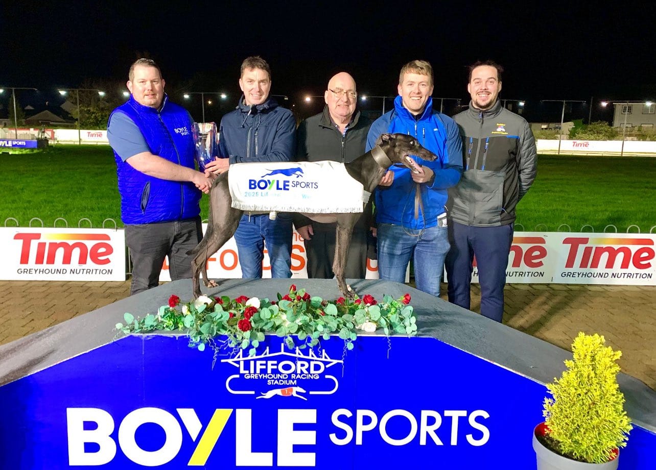 Pat Guilfoyle's Irish Derby finalist was yet to win in the event having struggled to see out the trip round the stiff circuit but pinged from trap two and was always in command.
