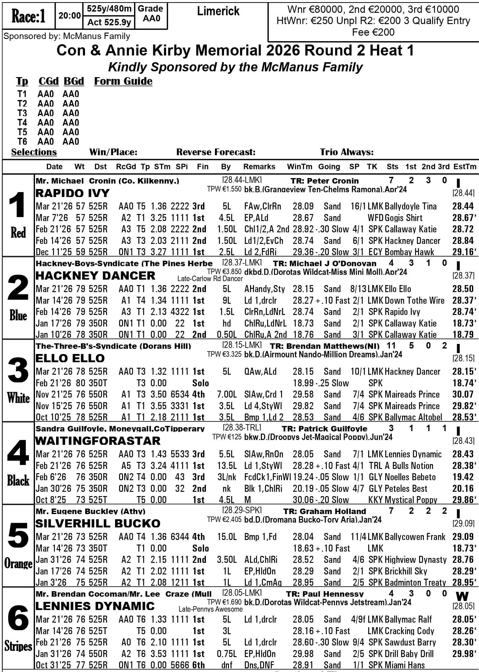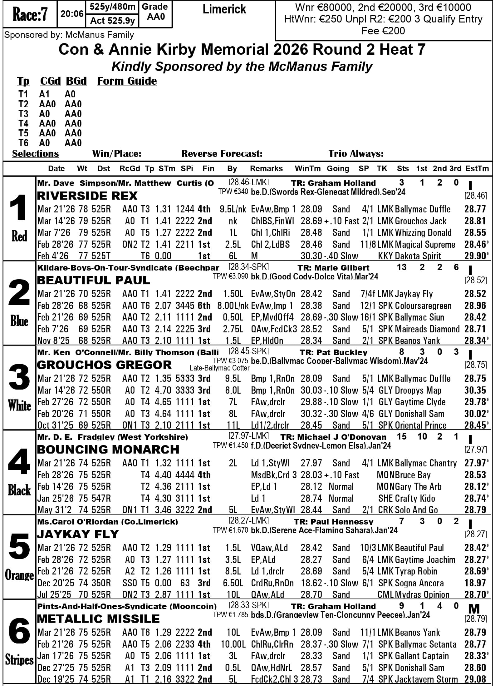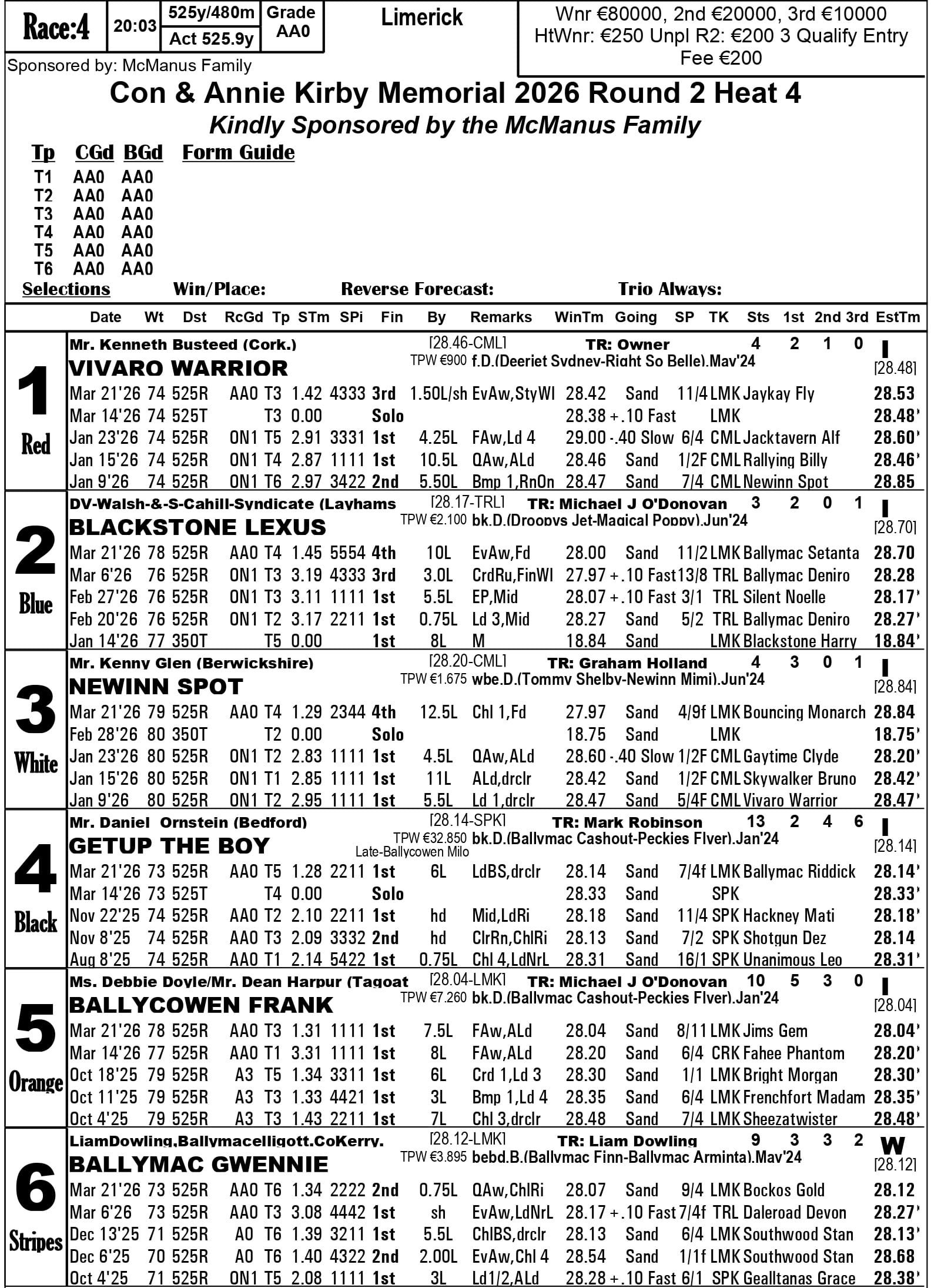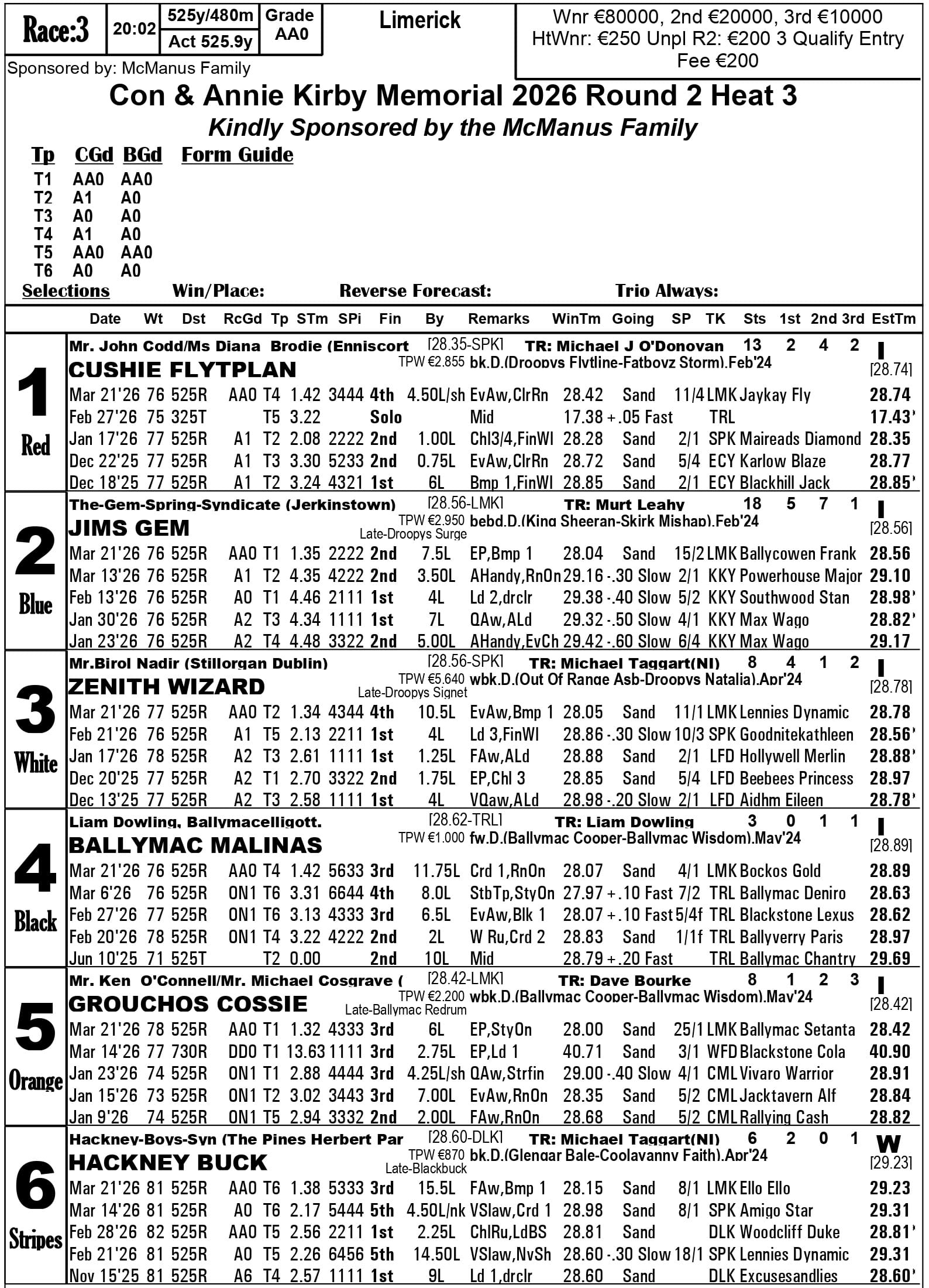 Fourth-placed qualifiers - heat 1 Silverhill Bucko, heat 2 Droopys Map, heat 3 Jacktavern Bull, heat 4 Riverside Rex, heat 6 Newinn Spot, heat 8 Zenith Wizard, heat 9 Cushie Flytplan, heat 10 Blackstone Lexus, heat 13 Canavour Bucko.
