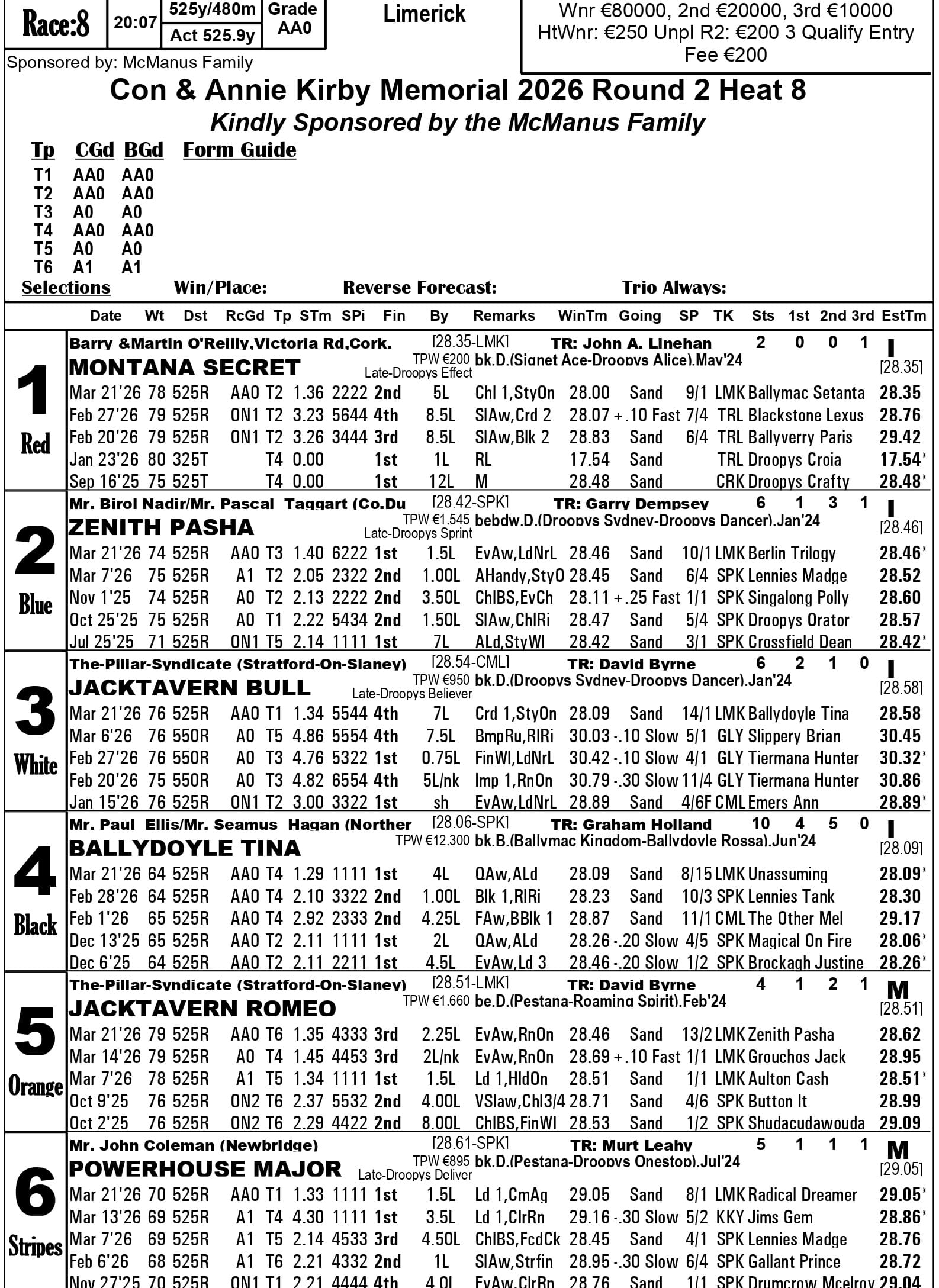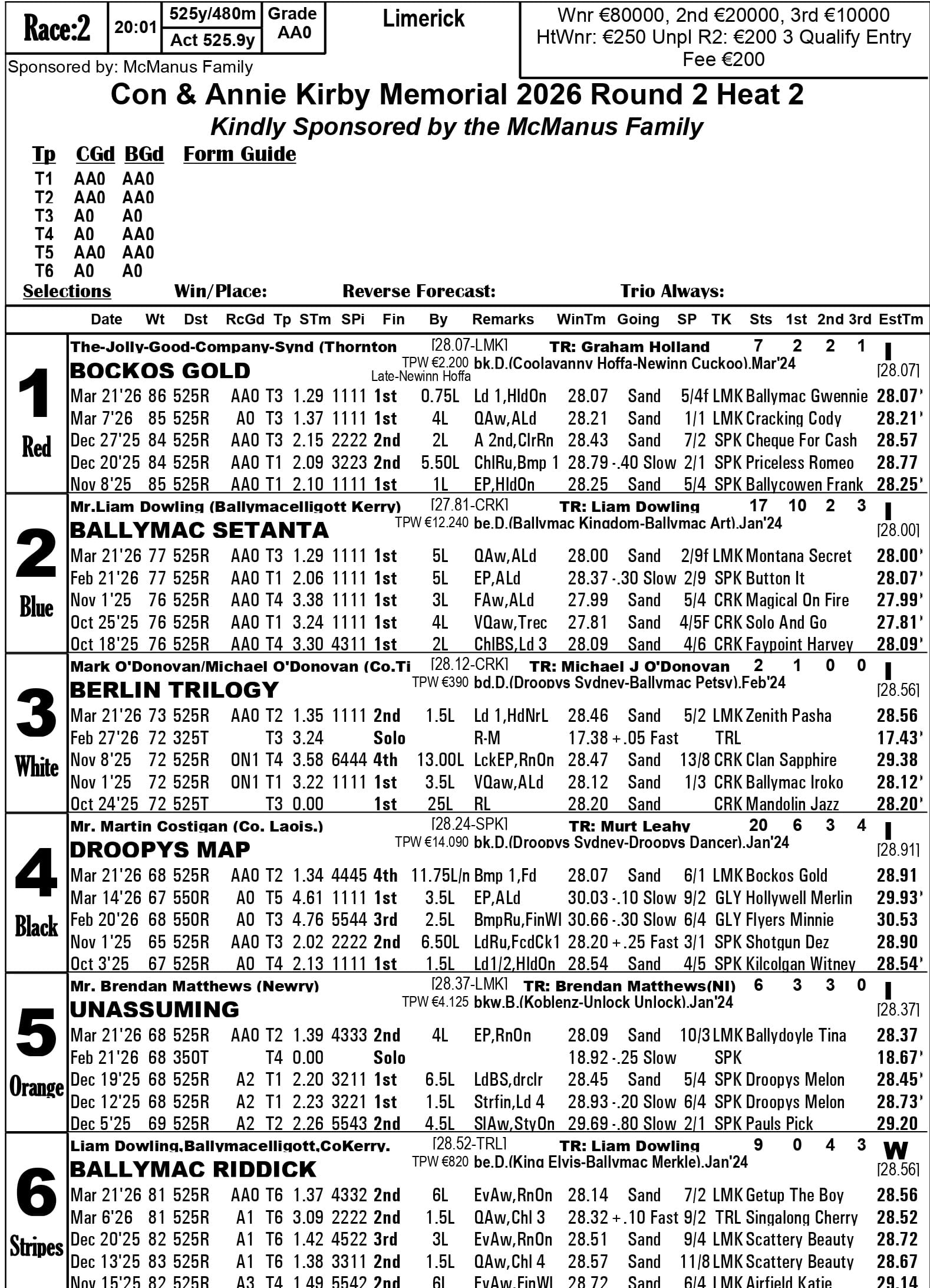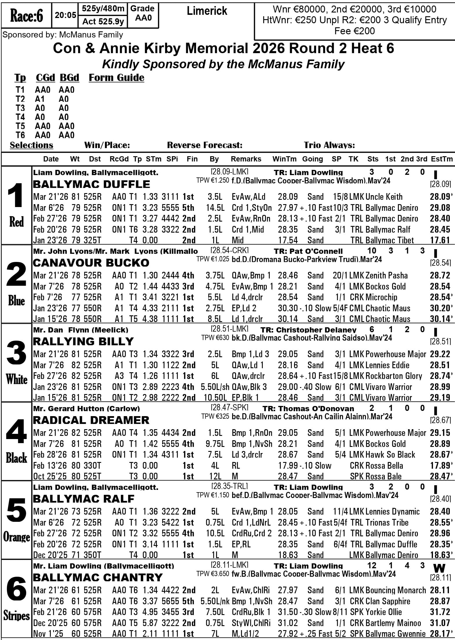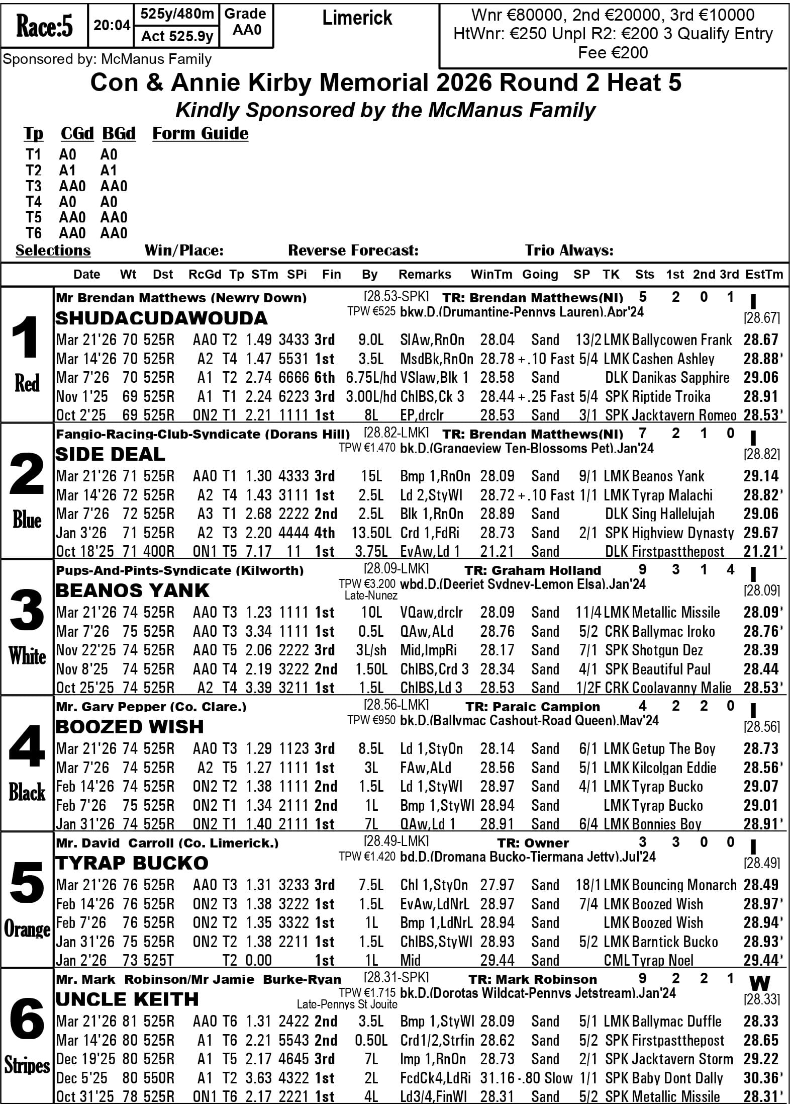 Fourth-placed qualifiers - heat 1 Silverhill Bucko, heat 2 Droopys Map, heat 3 Jacktavern Bull, heat 4 Riverside Rex, heat 6 Newinn Spot, heat 8 Zenith Wizard, heat 9 Cushie Flytplan, heat 10 Blackstone Lexus, heat 13 Canavour Bucko.