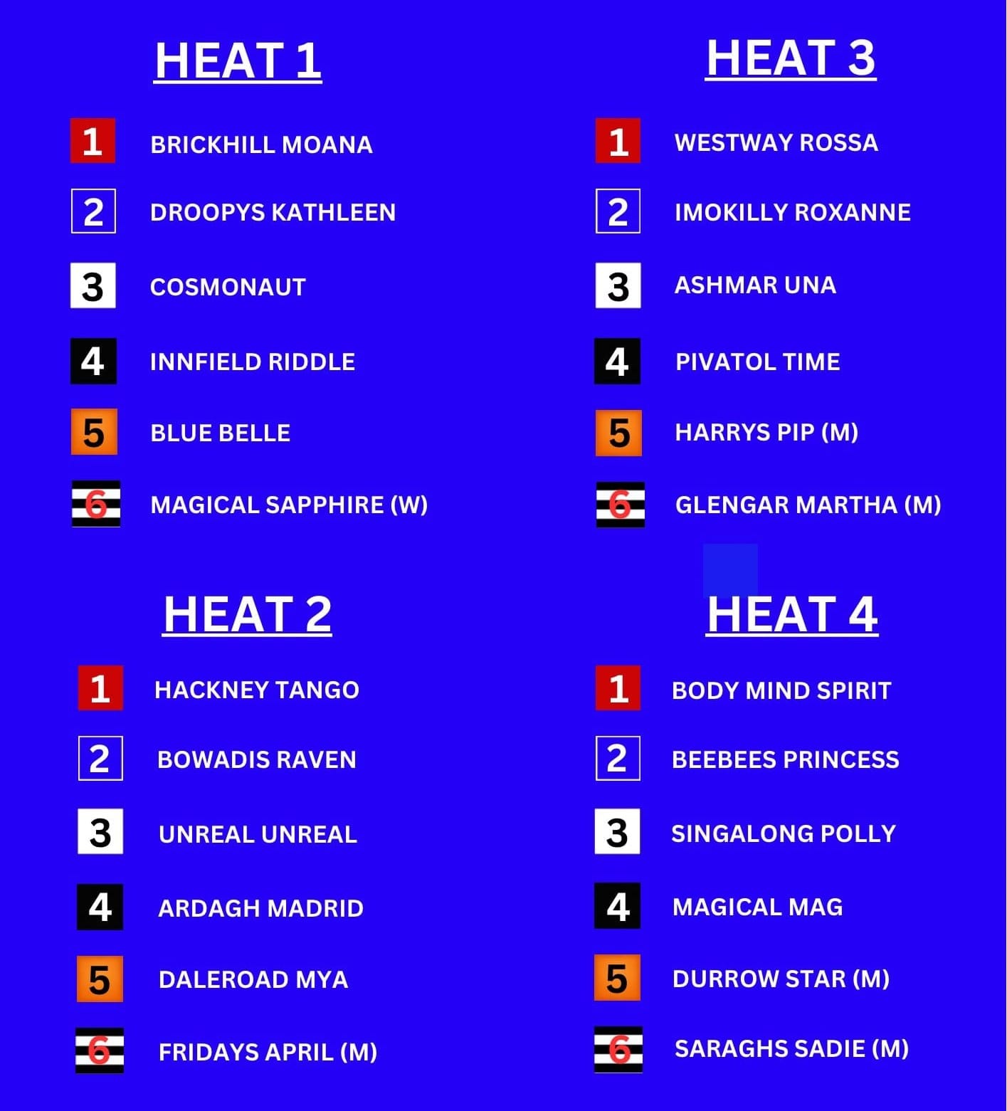 BOYLE Sports (Lifford Oaks): 6-4 Droopys Kathleen, 4 Magical Mag, 6 Glengar Martha, 8 Hackney Tango, 10 Westway Rossa, 12 Magical Sapphire, 14 Body Mind Spirit, 16 Imokilly Roxanne, Unreal Unreal, 20 Cosmonaut, Singalong Polly, 25 Bowadis Raven, 33 Ashmar Una, Brickhill Moana, Durrow Star, Innfield Riddle, Pivotal Time, 50 Beebees Princess, Blue Belle, Daleroad Mya, Fridays April, Saraghs Sadie, 66 Ardagh Madrid, 100 Harrys Pip (e-w 1/4 1,2,3,4).