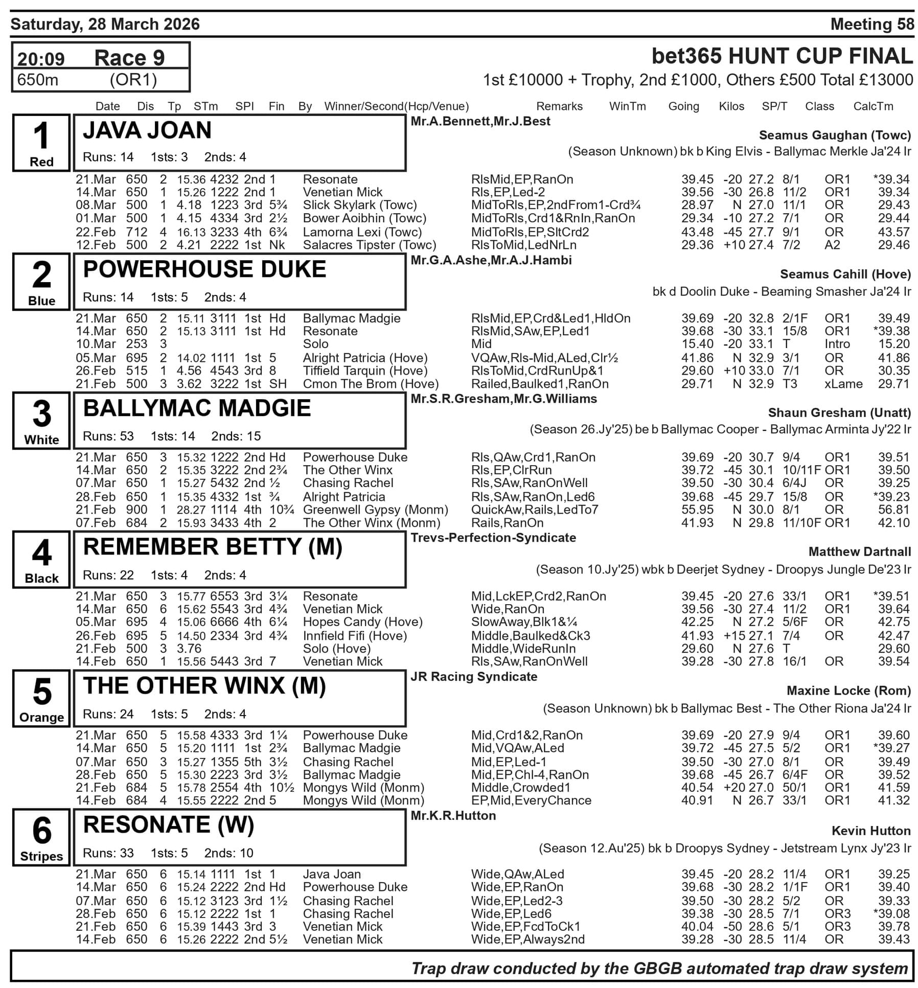 bet365 (Hunt Cup final): T1 Java Joan 6/1, T2 Powerhouse Duke 11/4, T3 Ballymac Madgie 10/3, T4 Remember Betty 33/1, T5 The Other Winx 3/1, T6 Resonate 5/2.
