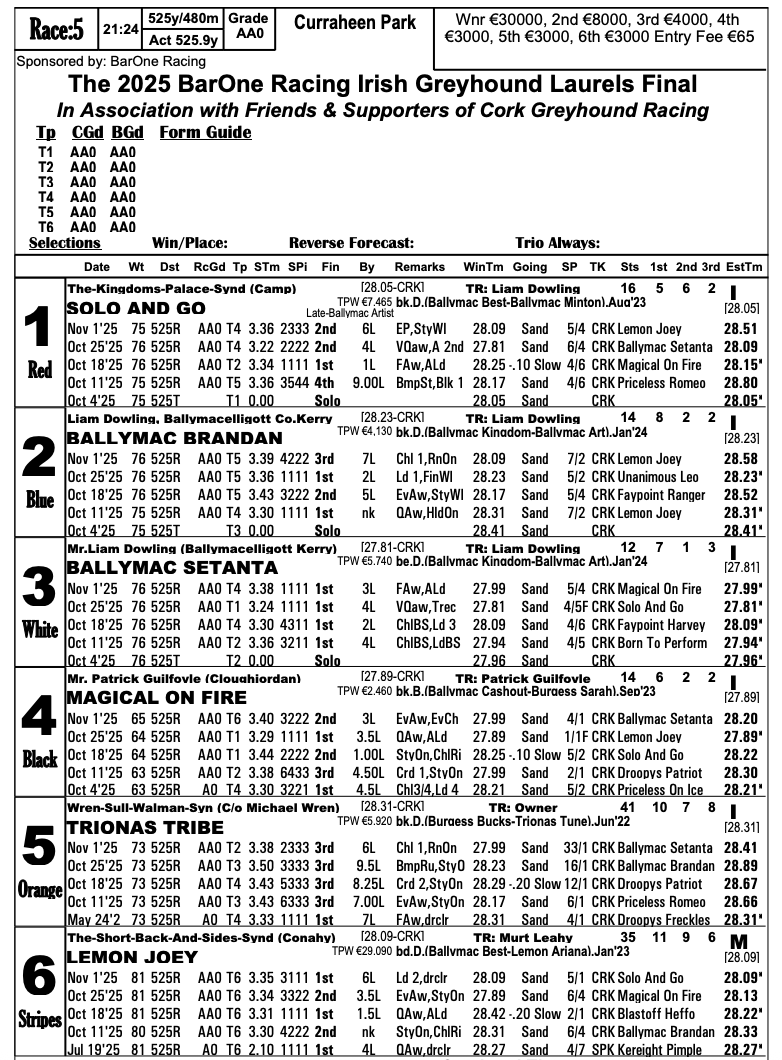Irish Laurels price guide: T1 Solo And Go 7/4, T2 Ballymac Brandan 8/1, T3 Ballymac Setanta 13/8, T4 Magical On Fire 11/2, T5 Trionas Tribe 33/1, T6 Lemon Joey 9/2 (e-w 1/4 1,2).