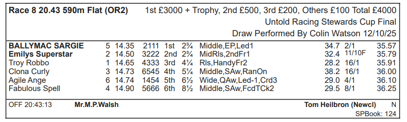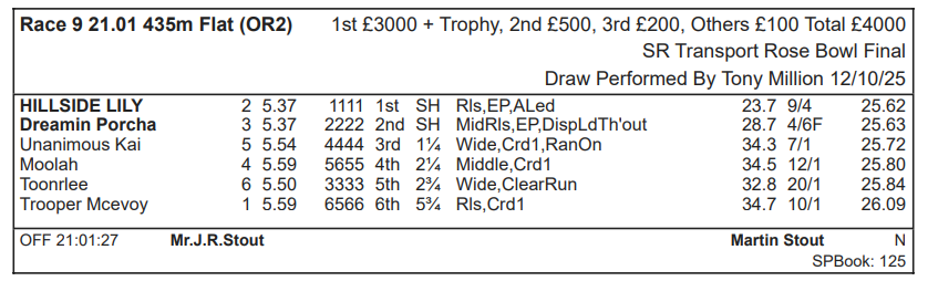 The Tom Heilbron-trained Ballymac Sargie, beaten at odds of 1/7 in the first round, confirmed semi-final supremacy over local star Emilys Superstar to land the £3,000 Untold Racing Stewards Cup final over 590m, with Hillside Lily, the only greyhound Martin Stout has in training, just getting the better of a thrilling ding-dong tussle with Dreamin Porcha in the £3,000 SR Transport Rose Bowl final over 435m.