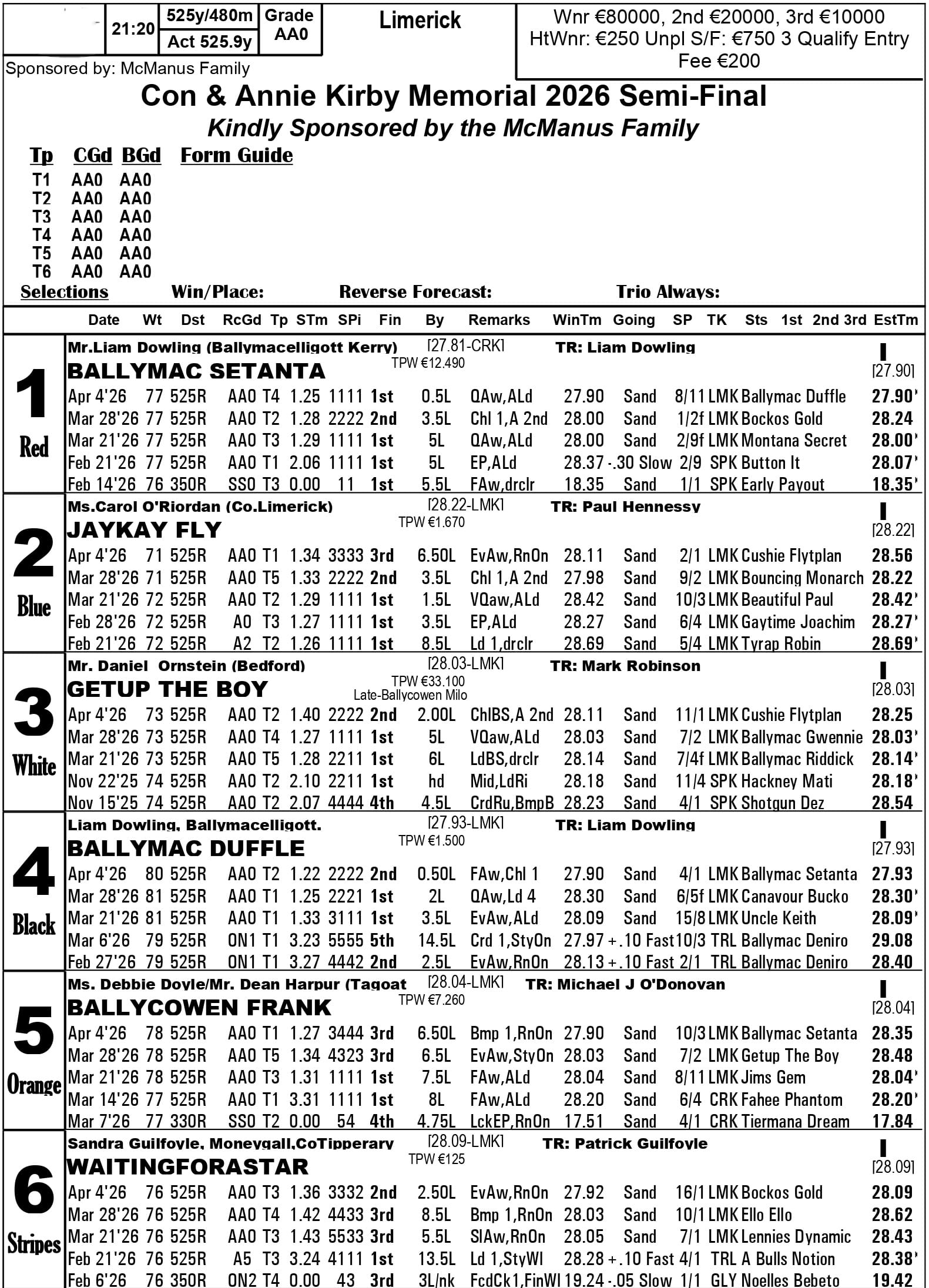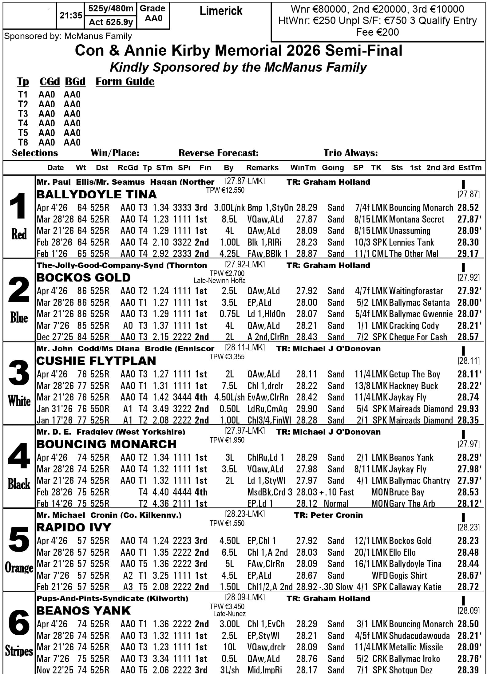 Con & Annie Kirby Memorial (Limerick, final Saturday 18th April): 11/4 Ballymac Setanta, 4 Bockos Gold, 5 Ballydoyle Tina, 8 Bouncing Monarch, 12 Ballymac Duffle, 14 Getup The Boy, 16 Ballycowen Frank, Cushie Flytplan, 20 bar (e-w 1/4 1,2,3).