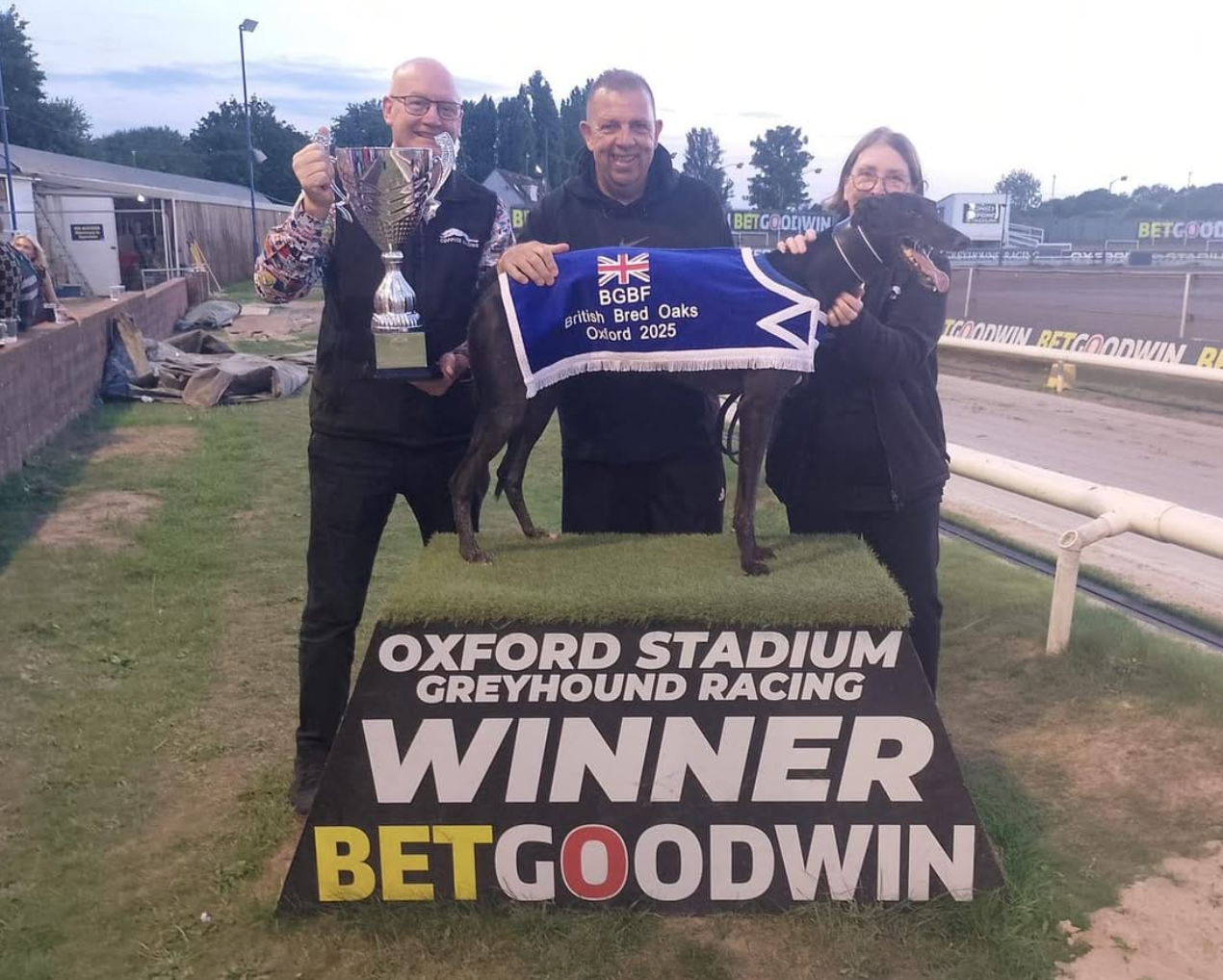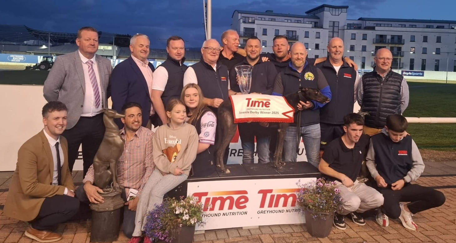 Trained by Mark Robinson for Daniel Ornstein, the January 2024 son of Ballymac Cashout and Peckies Flyer ran down long-time leader Unanimous Leo off the final bend, switching wide to deliver his challenge and getting up for a three-parts of a length victory in 28.31sec.