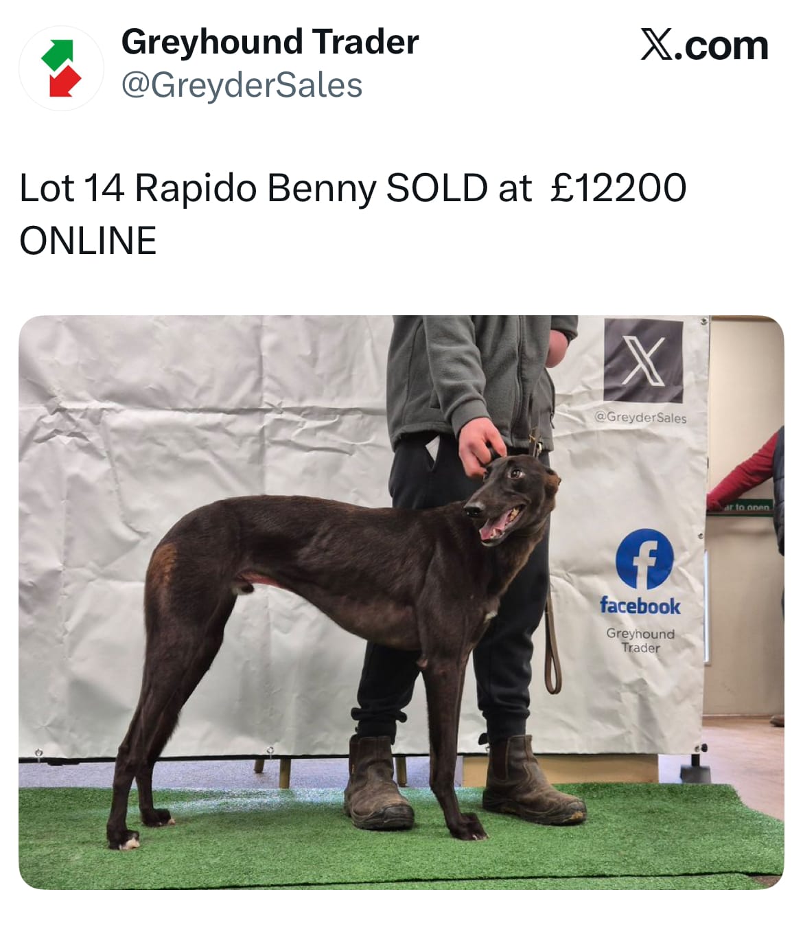 RAPIDO BENNY, an impressive winner of his sole career start at Waterford earlier in the month, was the early sale topper at Oxford’s Greyhound Trader October auction.